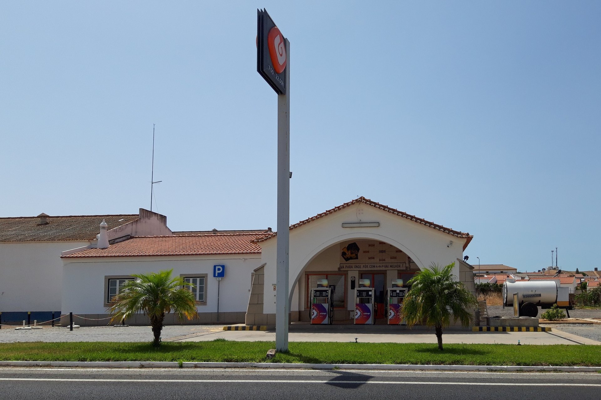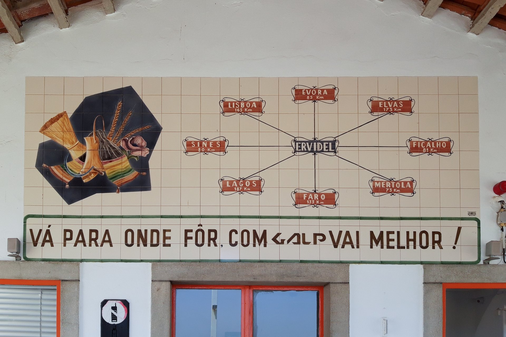 Em Ervidel, no concelho de Aljustrel, encontramos este painel azulejar de publicidade à Galp, num dos postos de abastecimento de combustível pertencentes à empresa. Sob fundo branco, podem ver-se em torno da identificação do lugar de Ervidel, a designação de outros destinos e a distância a estes. Do lado esquerdo podem ainda ver-se representados alguns produtos tradicionais e, abaixo, a mensagem “Vá para onde fôr, com Galp vai melhor!”, em que Galp é exibido através do logótipo original, criado por Luís Filipe Abreu, em 1978. “Naquele tempo havia muitos artistas plásticos, escultores e mesmo autodidatas a fazer o agora chamado design” confessa o professor catedrático, como pode ler-se na página dedicada à celebração dos 40 anos da Galp.
