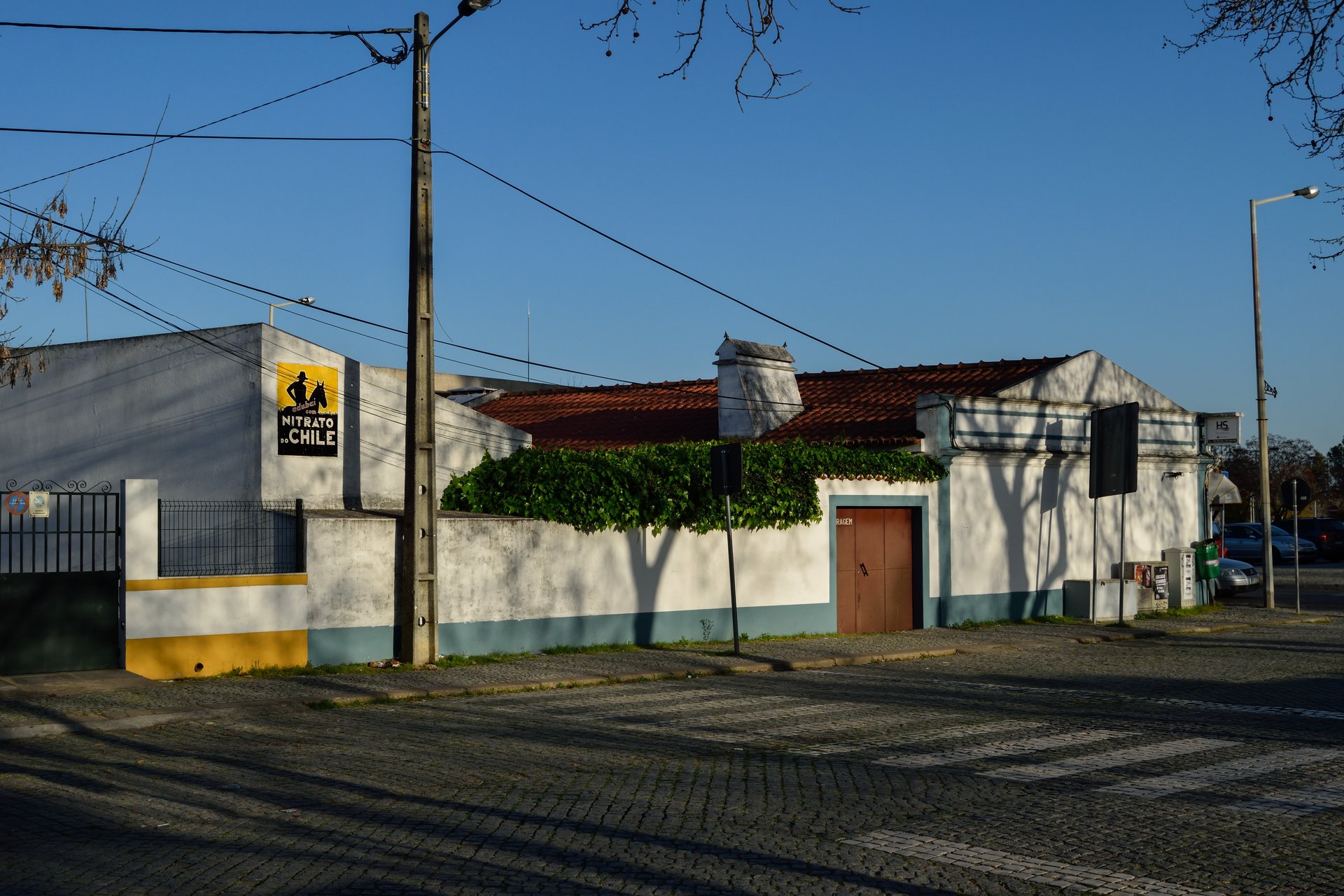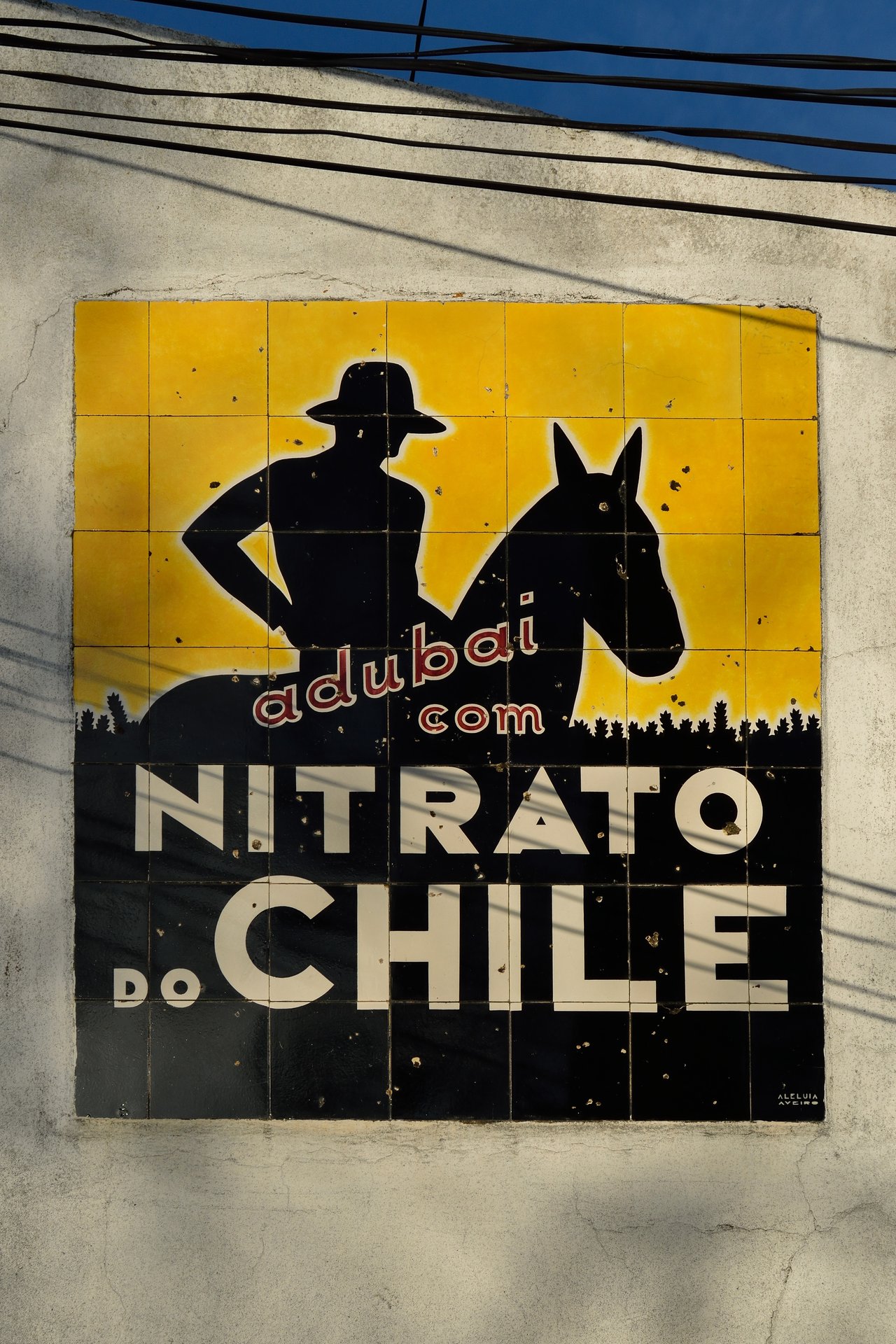 Junto à escola secundária André de Gouveia, em Évora, encontramos este painel publicitário. "Por muito viajado que fosse o leitor só poucos sabiam em que curva do planeta se desenrolava o Chile. E que interesse teria para os agricultores o conhecimento de tal geografia? Preferiam, antes, provar na prática que a força dos nitratos adubava a terra. Se dúvidas houvesse, lá estava a imagem do homem a cavalo, a esclarecer. «Adubai com Nitrato do Chile», e o modo do verbo não deixava dúvidas sobre a opção." em A Publicidade no Azulejo de Jorge Correia Santos e Fernando Bento Gomes.