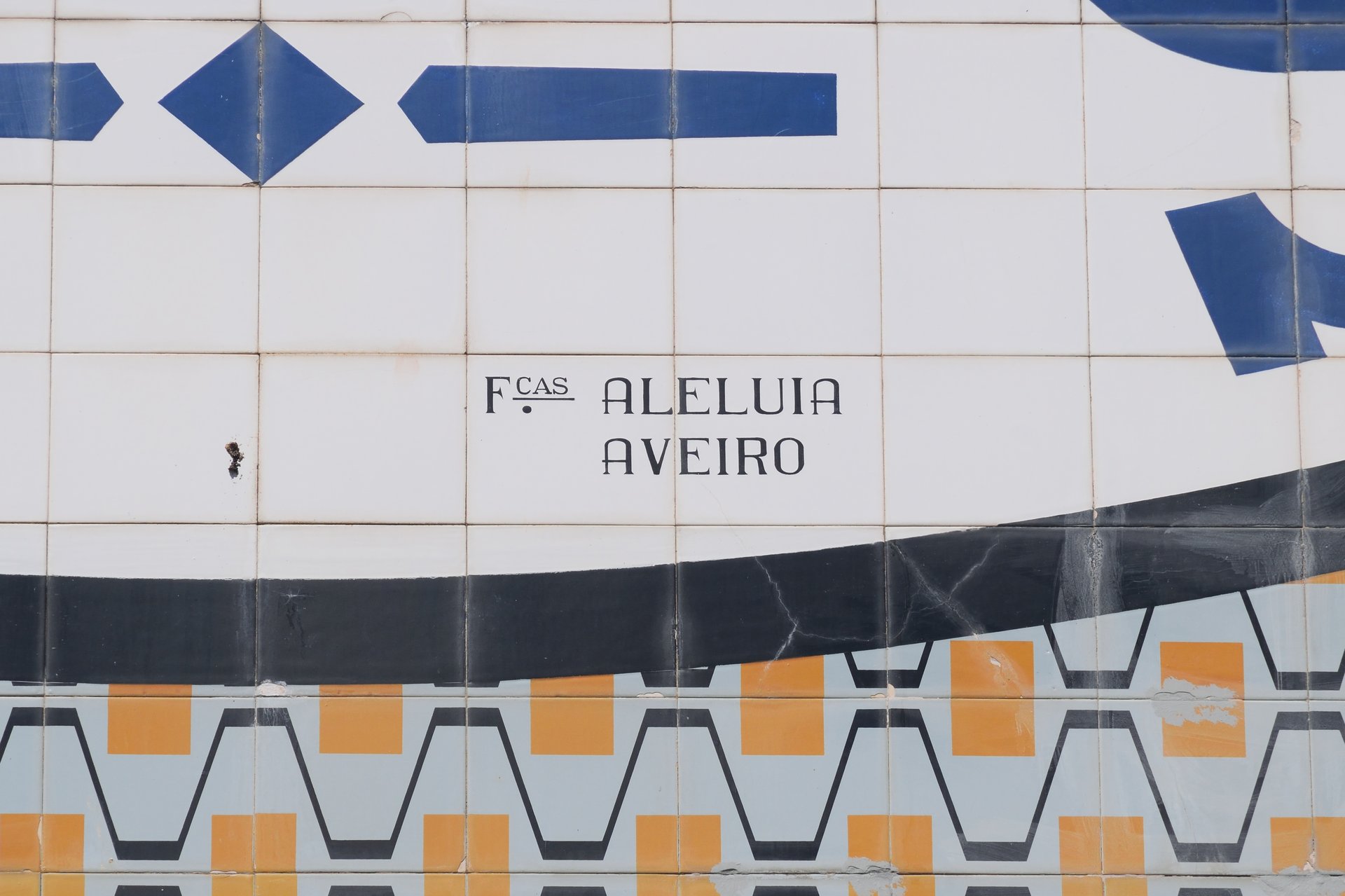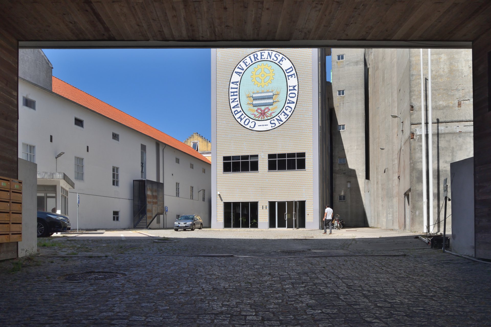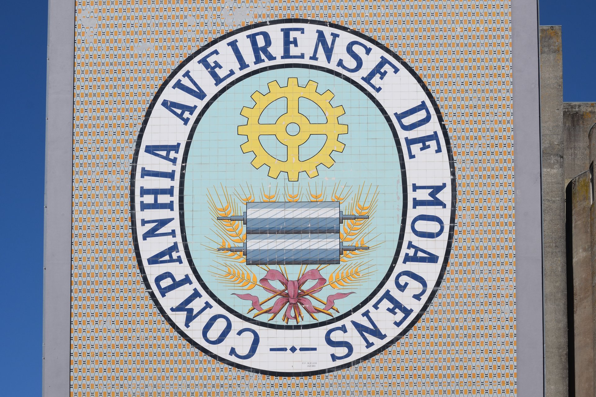 No atual edifício da Fábrica Centro Ciência Viva, nos Santos Mártires em Aveiro, encontramos um emblema oval em azulejos com a inscrição “Companhia Aveirense de Moagens”, assinado pelas Fábricas Aleluia. No centro da composição está uma engrenagem, um símbolo comum nas antigas empresas fabris. O desenho inclui ainda cilindros de moagem a triturar uma gavela de trigo atada com um torçal vermelho, uma representação que desvenda a função original daquela fábrica.