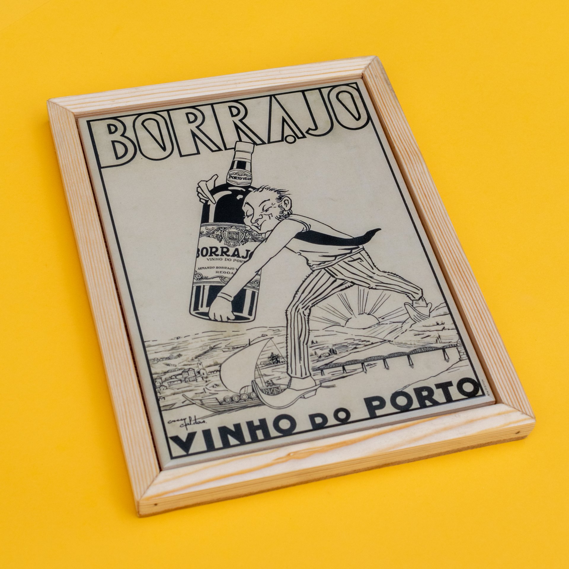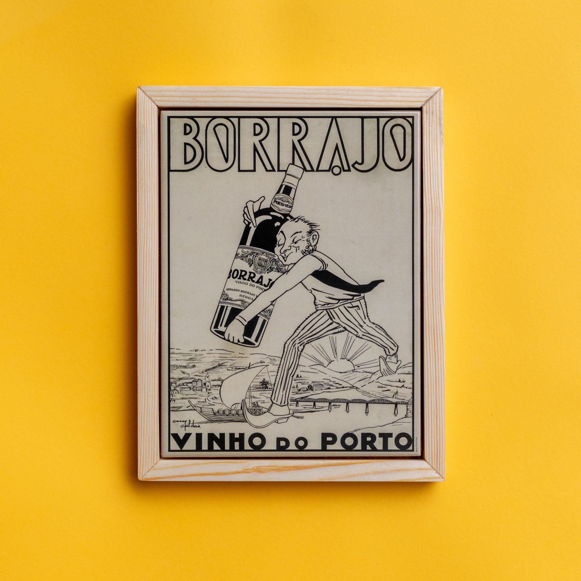 The sketch is available at the Porto Municipal Archive and relates to an advertisement for Borrajo Port Wine. The entire set is absolutely delightful. The scale of the giant walking through Peso da Régua and carefully holding an equally colossal bottle, the typography... the entire painting deserves attention and is a testament to the advertising culture of the time related to Port Wine.
