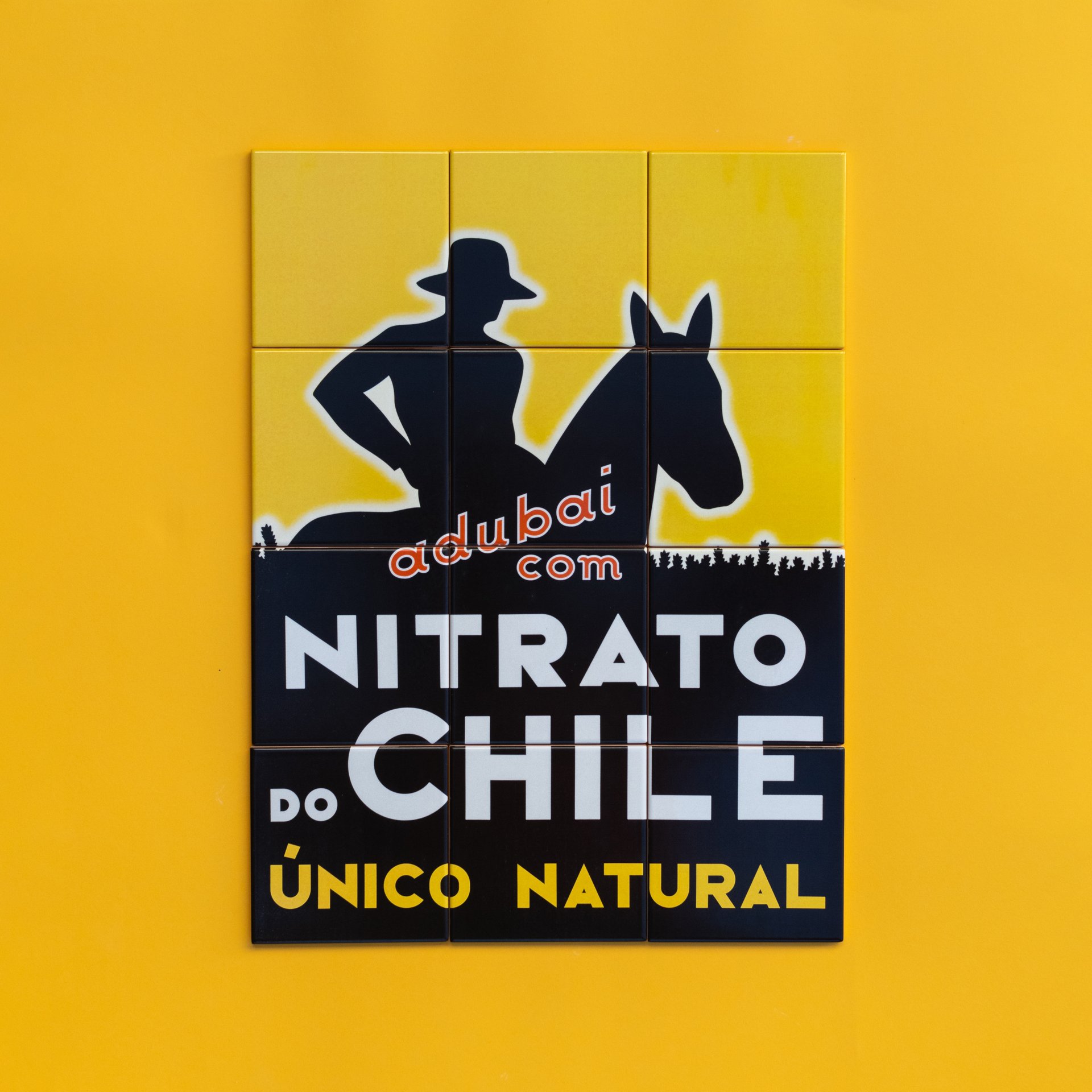 4x3 replica in 10 cm glazed tiles, with a total dimension of 40x30 cm, of the iconic Nitrato do Chile advertising tile.