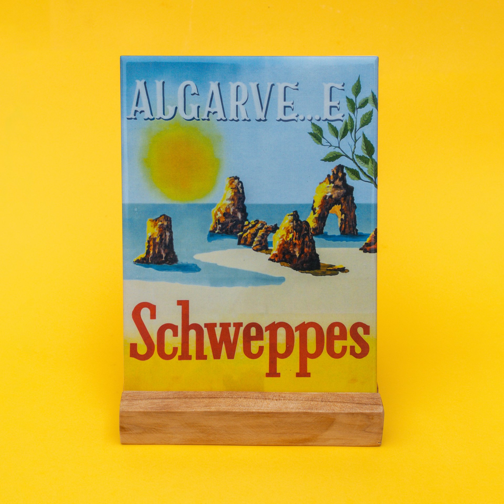 Glazed tile of 20x15 cm inspired by the advertising tile “Algarve… e Schweppes”. Part of the collection of mini-replicas of old advertising tiles, all with similar dimensions.
