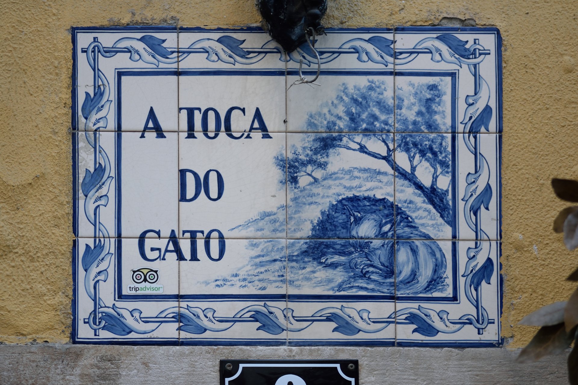 Na Rua dos Gatos, só podíamos mesmo encontrar um felino a guardar este painel: "A toca do gato". Este exemplar, que partilha o tamanho e o azul das placas toponímicas da área, data da década de 1980 e é obra de várias mãos, como parece comprovar a sua assinatura. O conjunto está colocado sobre a entrada do estabelecimento a que dá nome, um antigo restaurante, com alvará desde 1937. Numa composição equilibrada e rematada por moldura com motivos vegetais, conjugam-se texto e ilustração do animal no abrigo, enfatizado como tal pela particular representação das duas árvores que se vêm na imagem — é que parece que para aqueles lados fazia ventania!