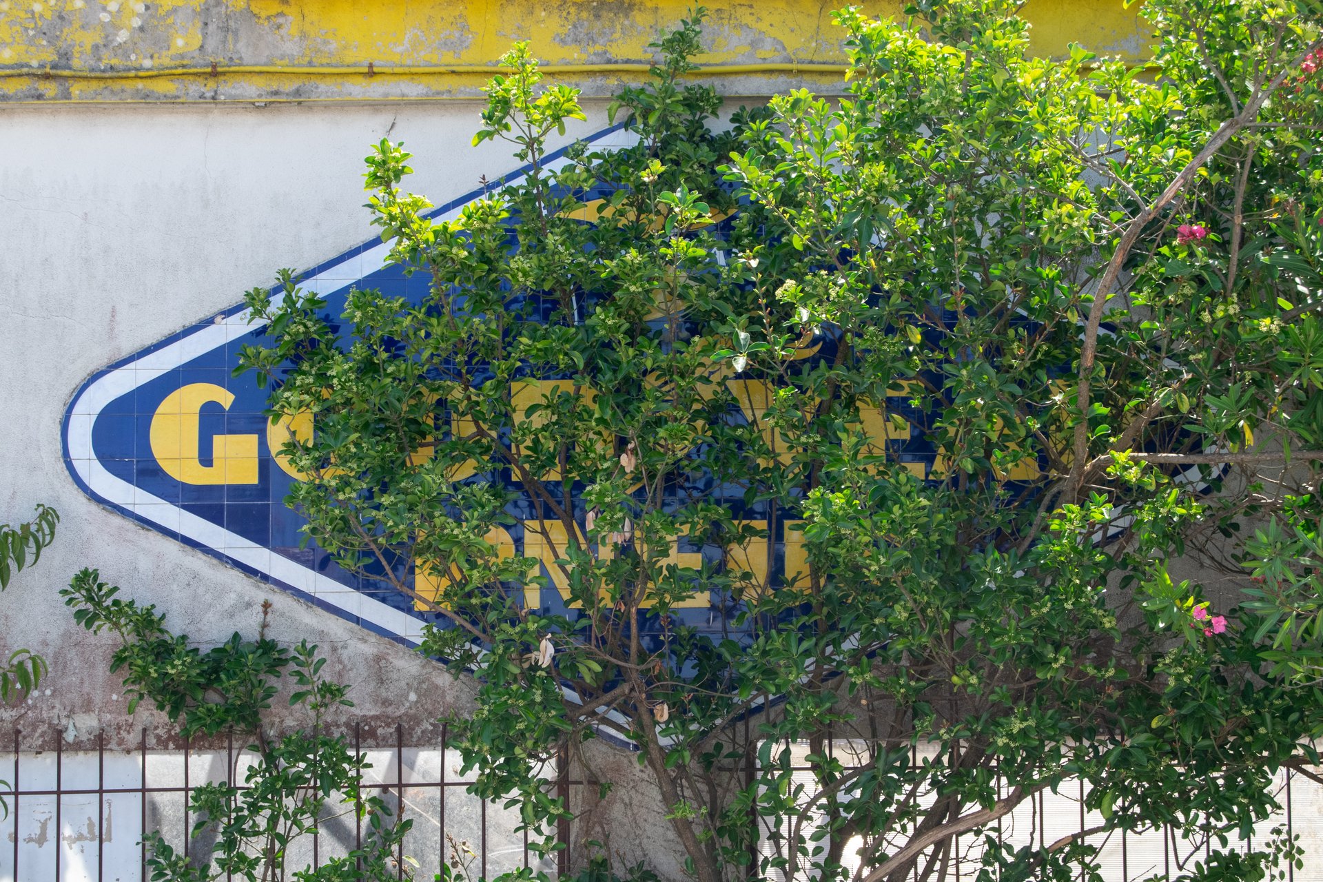 Contrariamente a outros painéis análogos que fotografamos anteriormente, este exemplar distingue-se pela presença de uma assinatura. Esta obra foi realizada na Fábrica Aleluia de Aveiro, possivelmente com recurso ao aerógrafo com estampilha. Existem outros painéis de azulejos da marca Goodyear, nomeadamente em oficinas, com cores e formatos distintos, que têm a assinatura do atelier Razamonte.