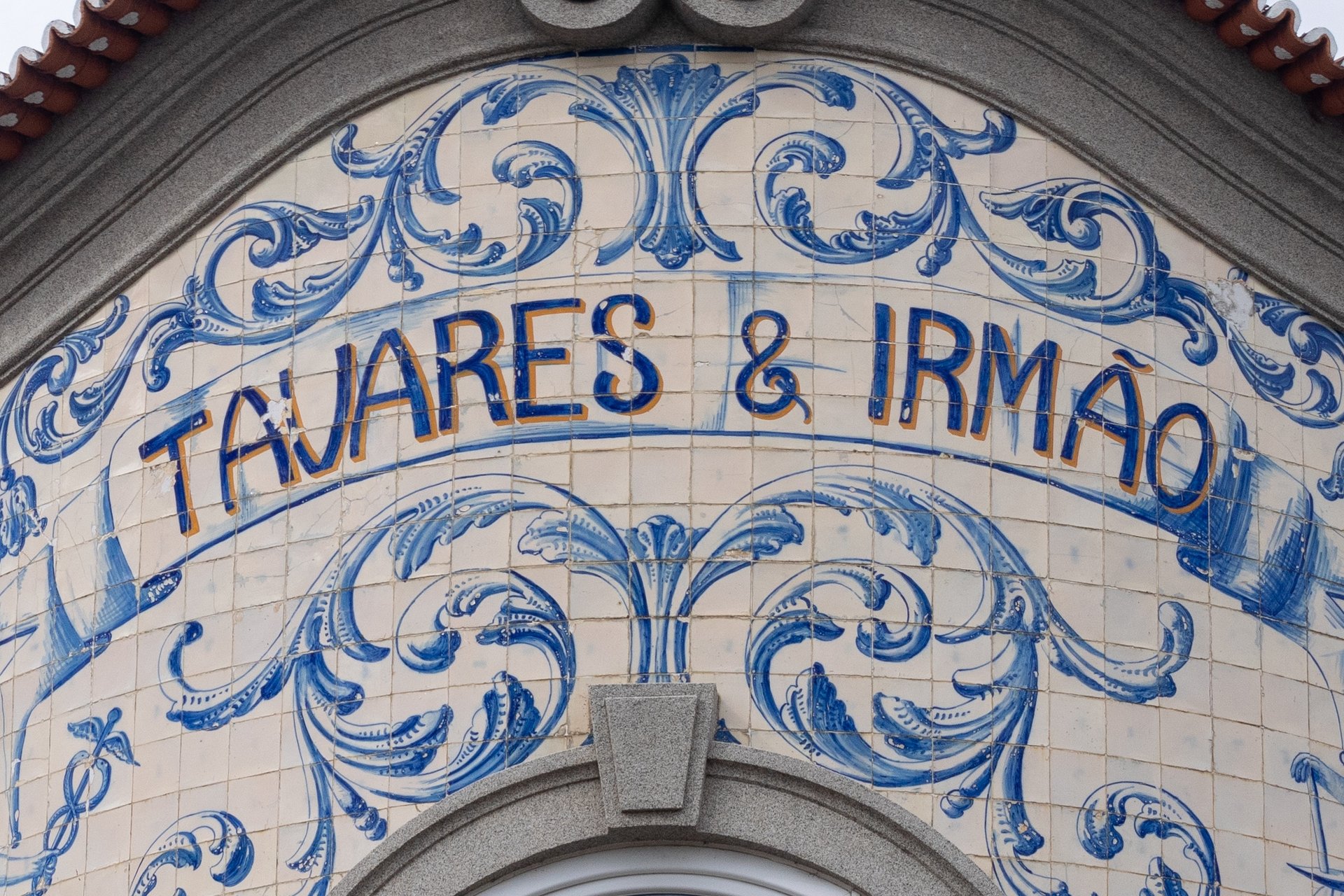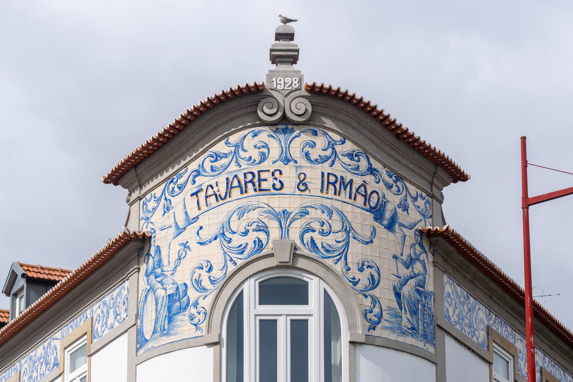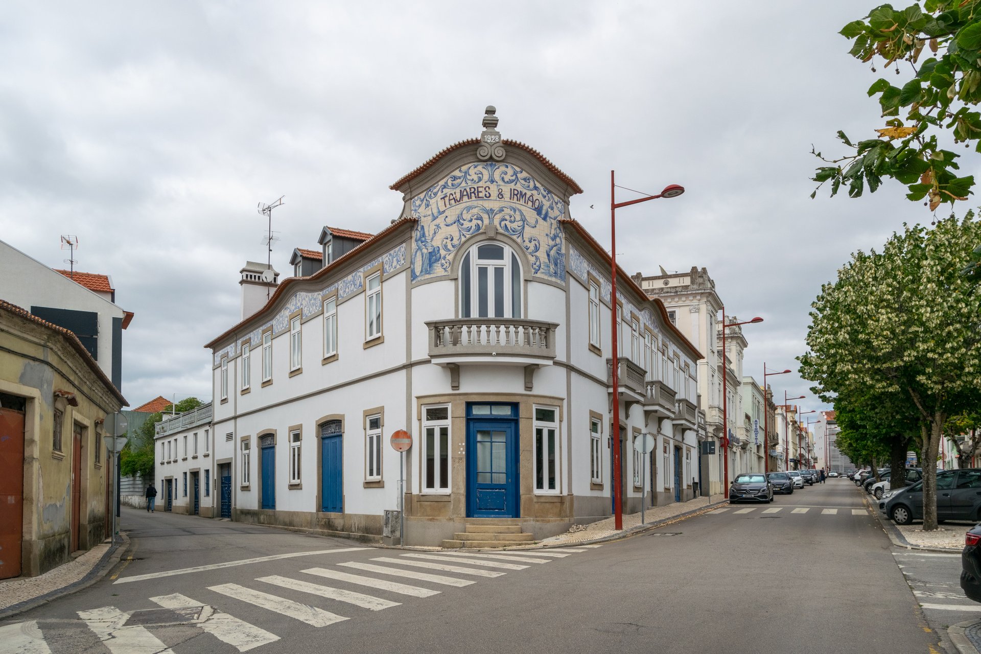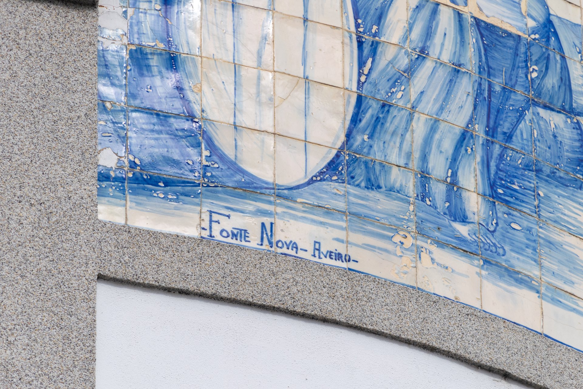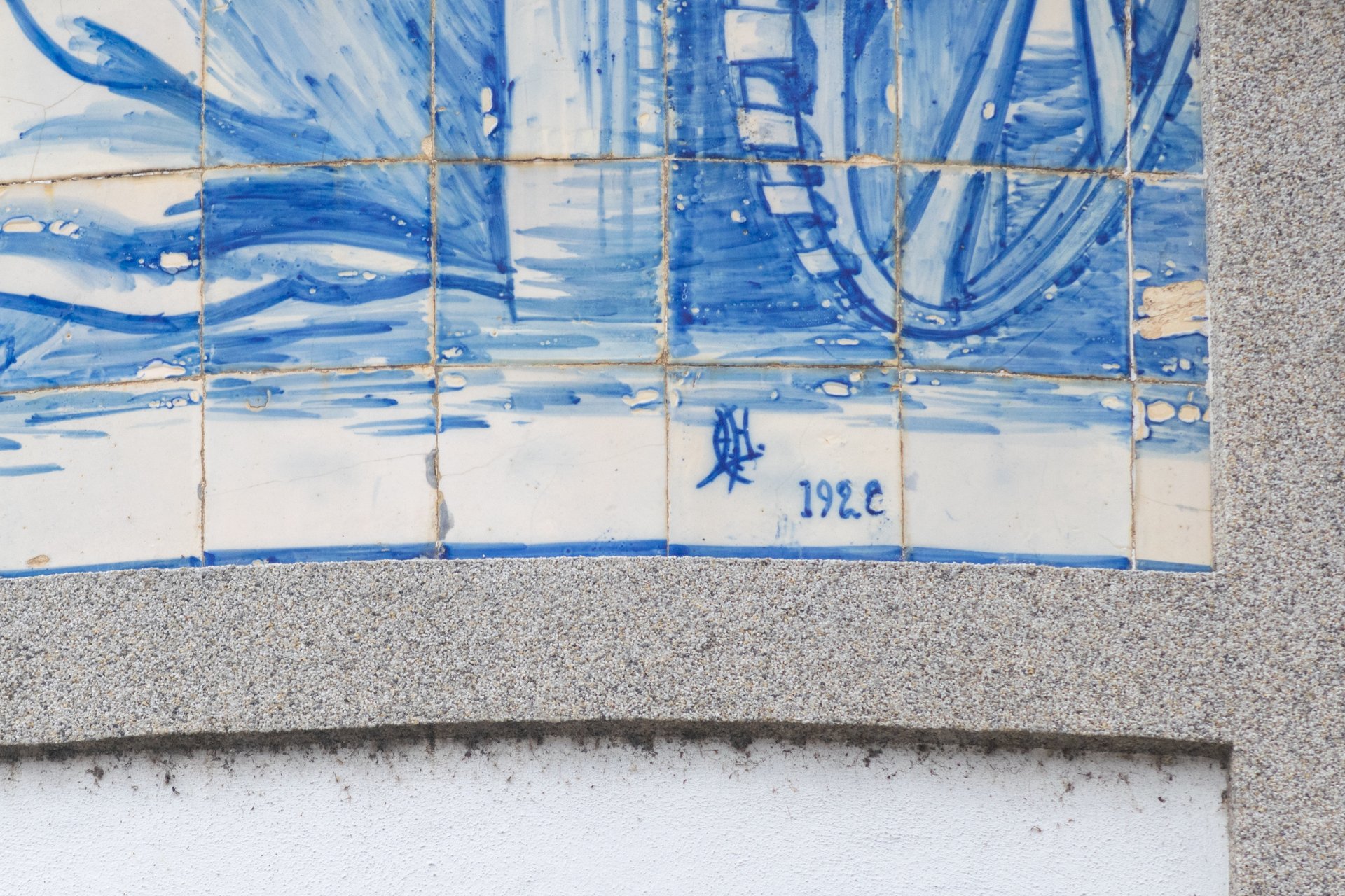 Painel de azulejos datado de 1928 e executado na Fábrica de Louça da Fonte Nova, Aveiro. Uma das fotografias mostra a rubrica do pintor ou, eventualmente, do encarregado da obra, que até agora não nos foi possível identificar. O painel encontra-se no edifício onde em tempos se situavam os armazéns da firma Tavares & Irmão.