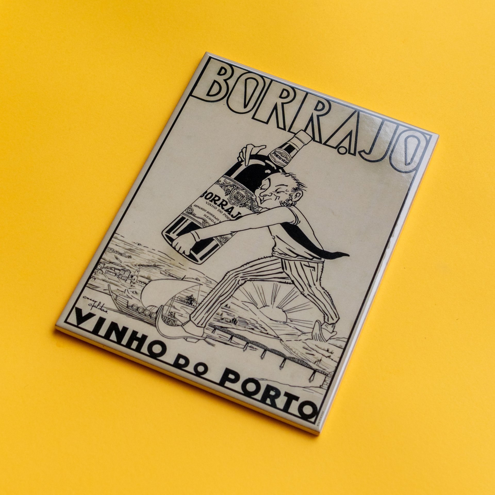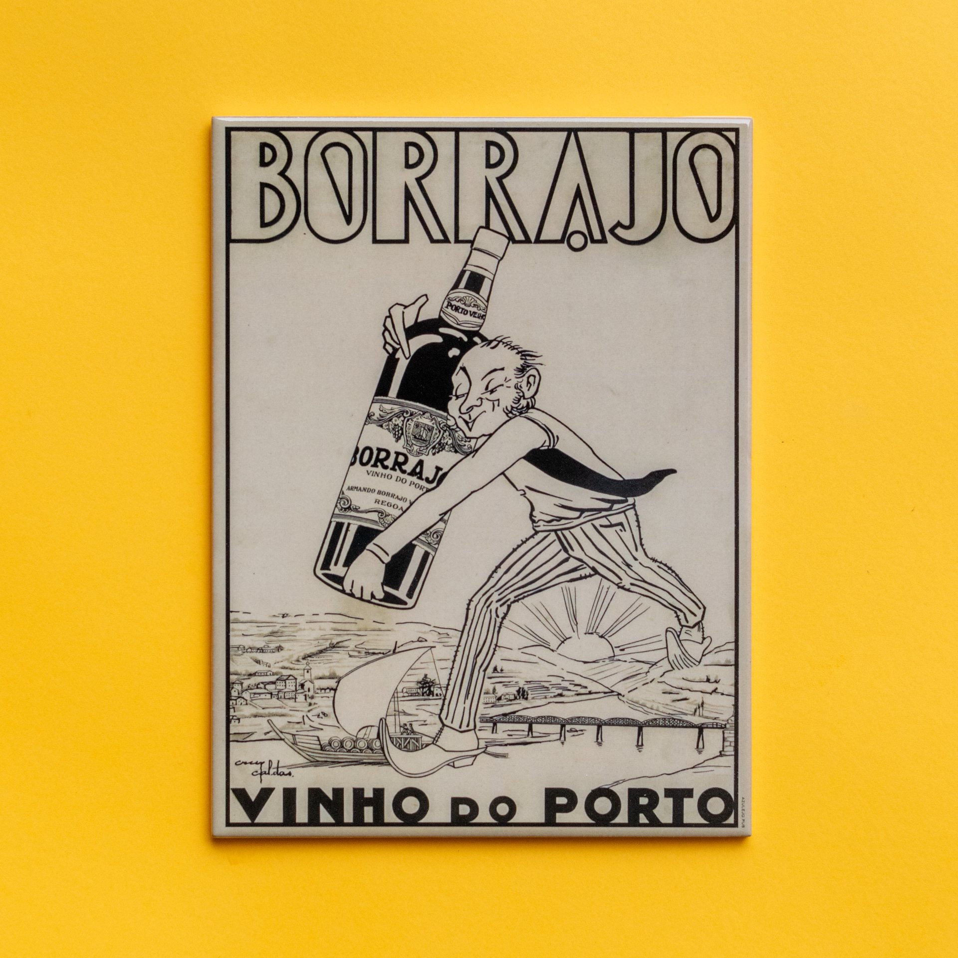 El boceto está disponible en el Archivo Municipal de Oporto y se refiere a una publicidad del Vino de Oporto Borrajo. Todo el conjunto es absolutamente delicioso. La escala del gigante pasando por Peso da Régua y sosteniendo cuidadosamente una botella igualmente colosal, la tipografía... toda la pintura merece atención y es un testimonio de la cultura publicitaria de la época relacionada con el Vino de Oporto.