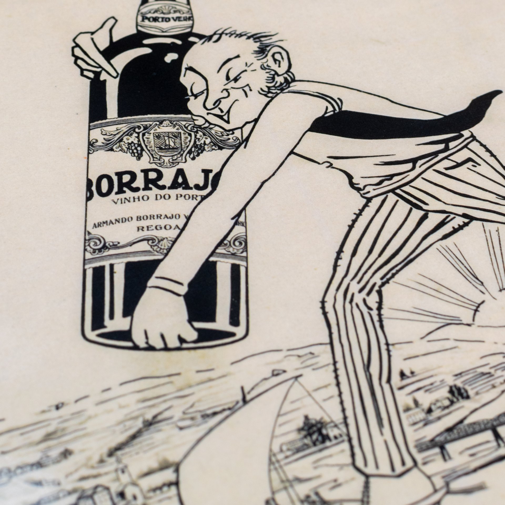 El boceto está disponible en el Archivo Municipal de Oporto y se refiere a una publicidad del Vino de Oporto Borrajo. Todo el conjunto es absolutamente delicioso. La escala del gigante pasando por Peso da Régua y sosteniendo cuidadosamente una botella igualmente colosal, la tipografía... toda la pintura merece atención y es un testimonio de la cultura publicitaria de la época relacionada con el Vino de Oporto.
