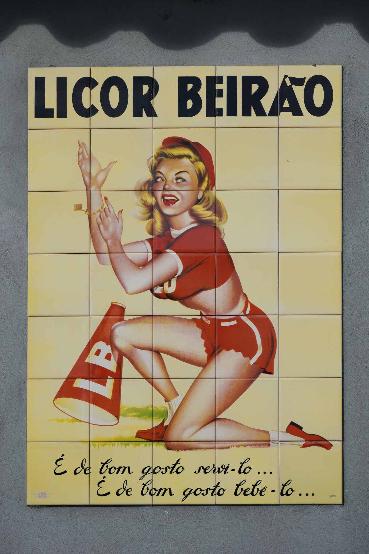 Em 1951, num país em que imperava uma sociedade conservadora que reduzia o papel feminino ao recato do lar, eis que a empresa lousanense Licor Beirão apresenta um novo cartaz publicitário. Neste figura uma pin-up de roupas curtas e de cor vermelha, numa ousadia que contrasta com a discrição que se impunha à mulher portuguesa de então. Ao fundo, num slogan um quanto irónico, pode ler-se "É de bom gosto servi-lo… É de bom gosto bebê-lo…". O painel azulejar fotografado encontra-se em Escalhão, Figueira de Castelo Rodrigo, e trata-se duma réplica criada a partir desse mesmo cartaz, produzida pela Oficina Cerâmica de Pombal há apenas alguns anos.