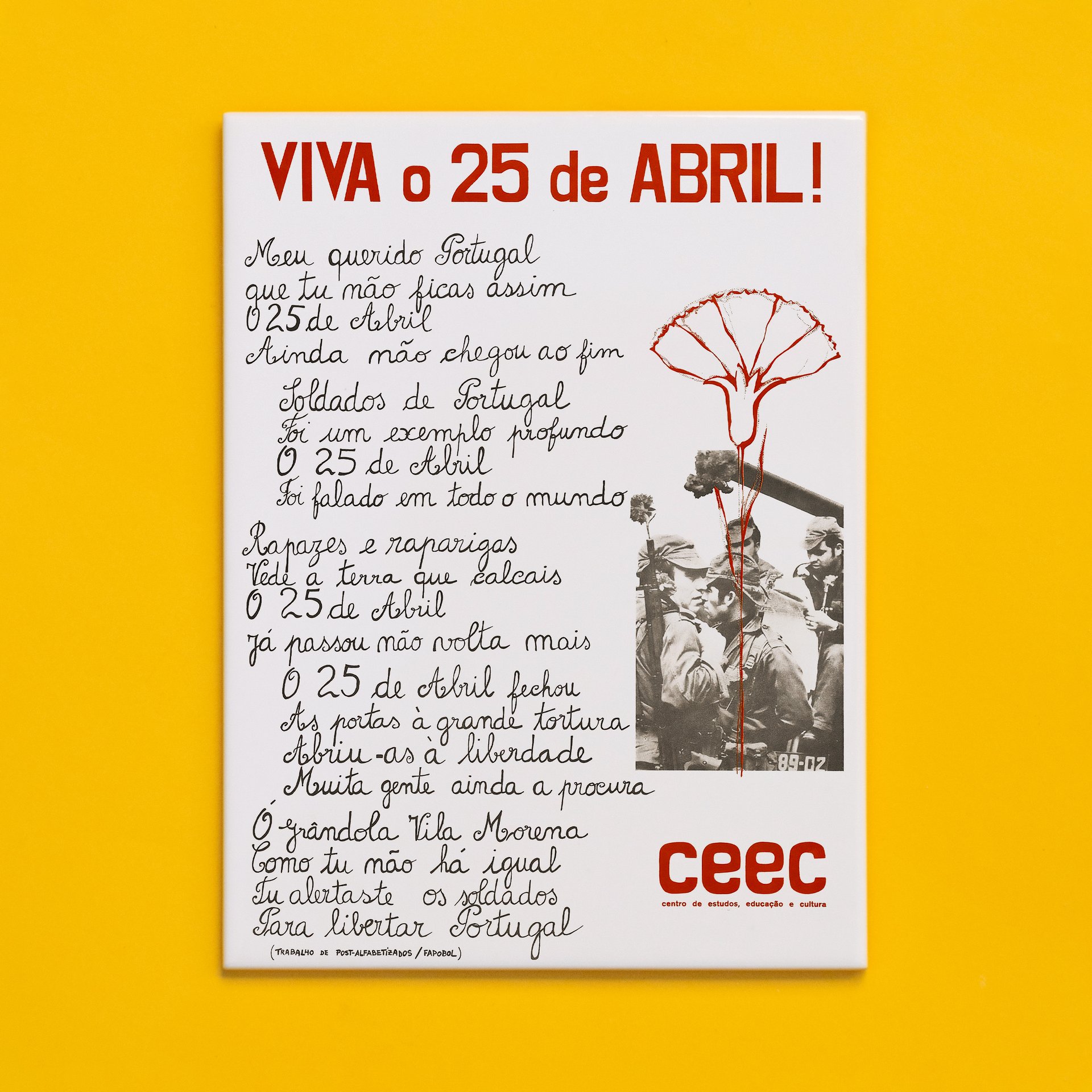 Baseado num cartaz concebido por trabalhadores alfabetizados pelo CEEC – Centro de Estudos Educação e Cultura. Tem como título “Viva o 25 de Abril!” e está escrito em quadras populares, acompanhadas da fotografia de um grupo de soldados com cravos nas espingardas, captada em Lisboa durante a revolução e de onde se destaca o Capitão Salgueiro Maia. Em 1970, 1 em cada 4 portugueses não sabia ler nem escrever.