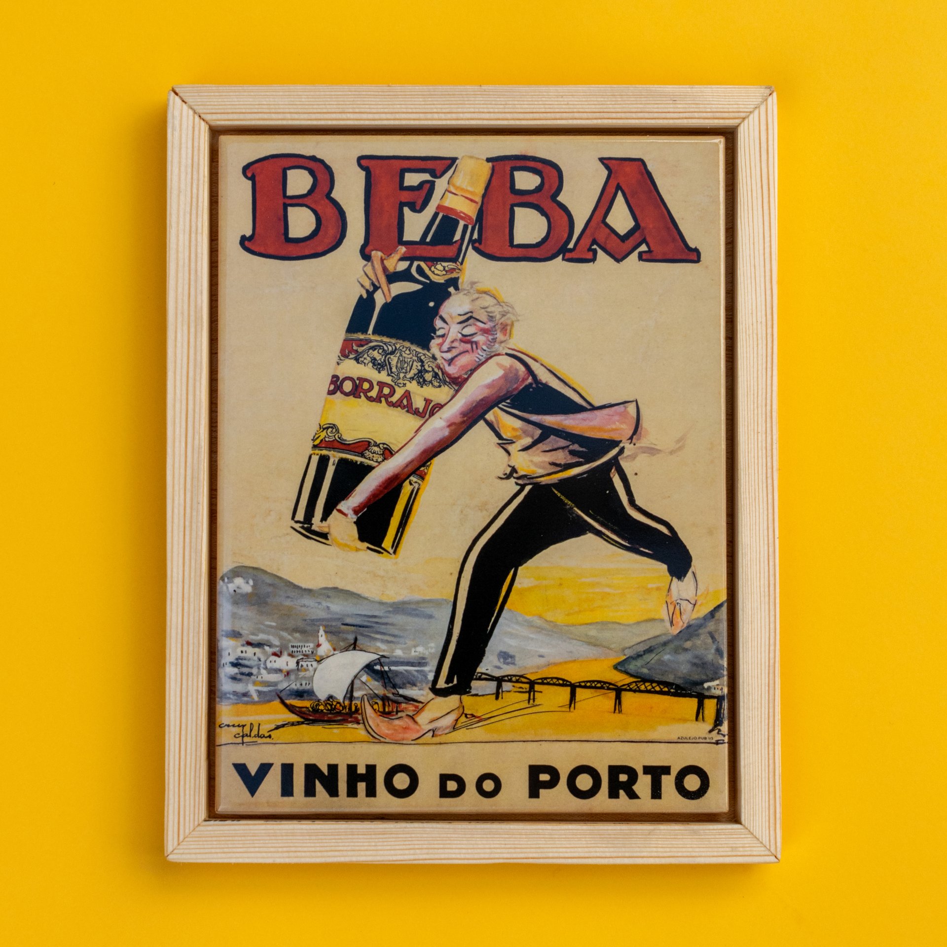 O esboço está disponível no Arquivo Municipal do Porto e é relativo a uma publicidade ao Vinho do Porto Borrajo. Todo o conjunto é absolutamente delicioso. A escala do gigante a passar por Peso da Régua e a segurar cuidadosamente uma garrafa igualmente colossal, a escolha da paleta de cores, a tipografia… toda a pintura merece destaque e é um testemunho da cultura publicitária da época relacionada com o Vinho do Porto.
