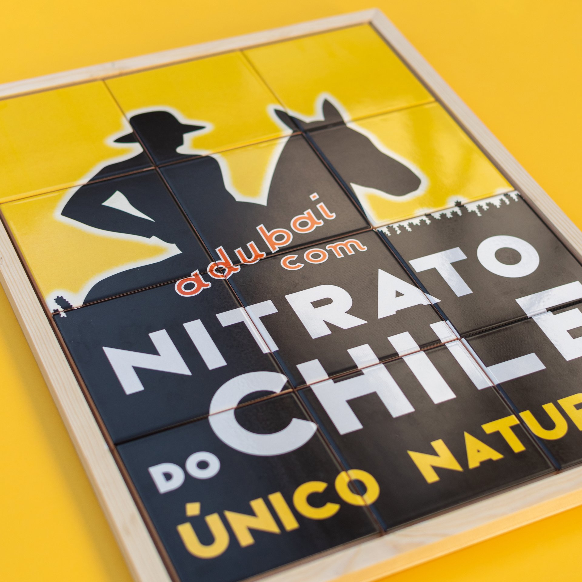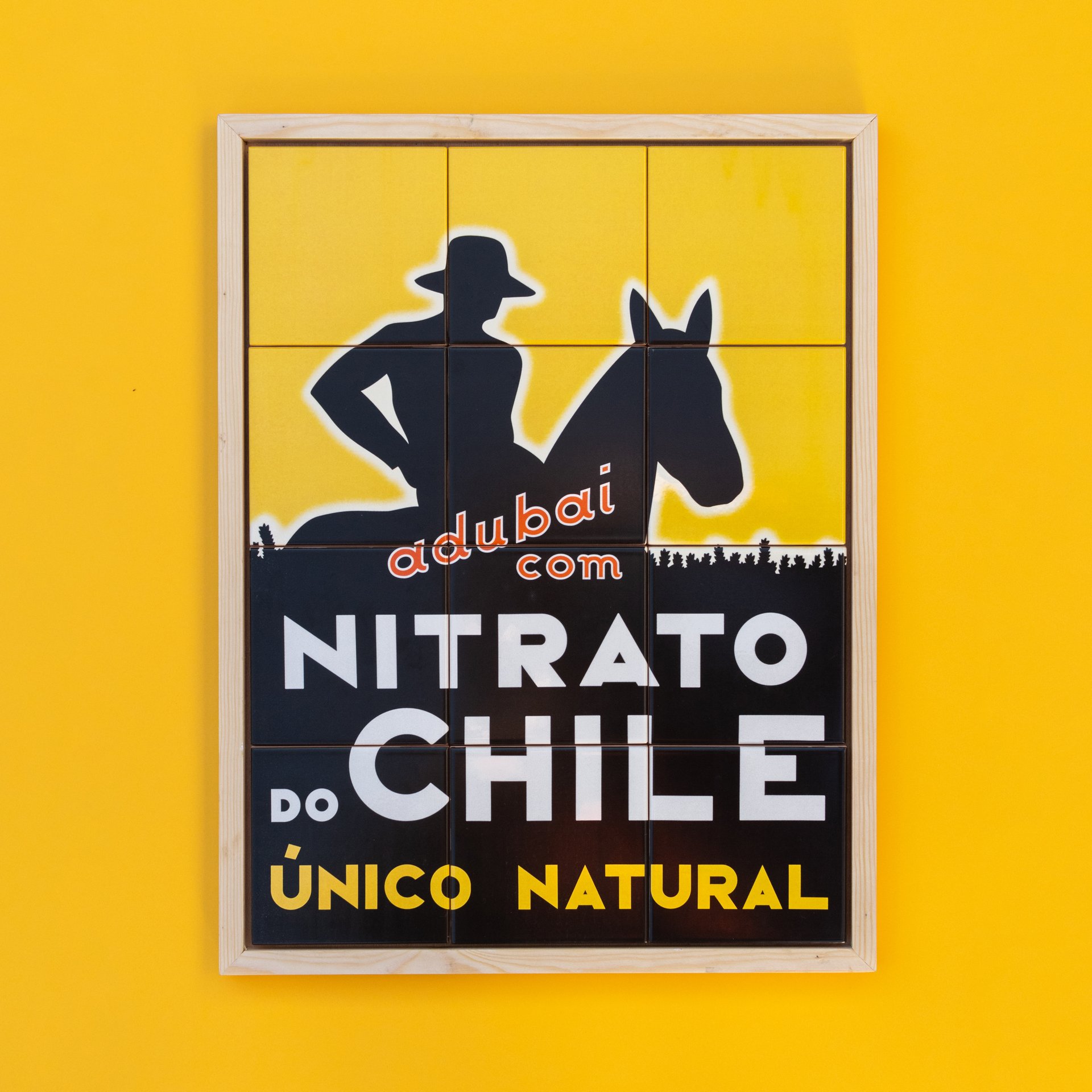 Réplica 4x3 em azulejos vidrados de 10 cm, com dimensão total 40x30 cm, do emblemático azulejo publicitário Nitrato do Chile.