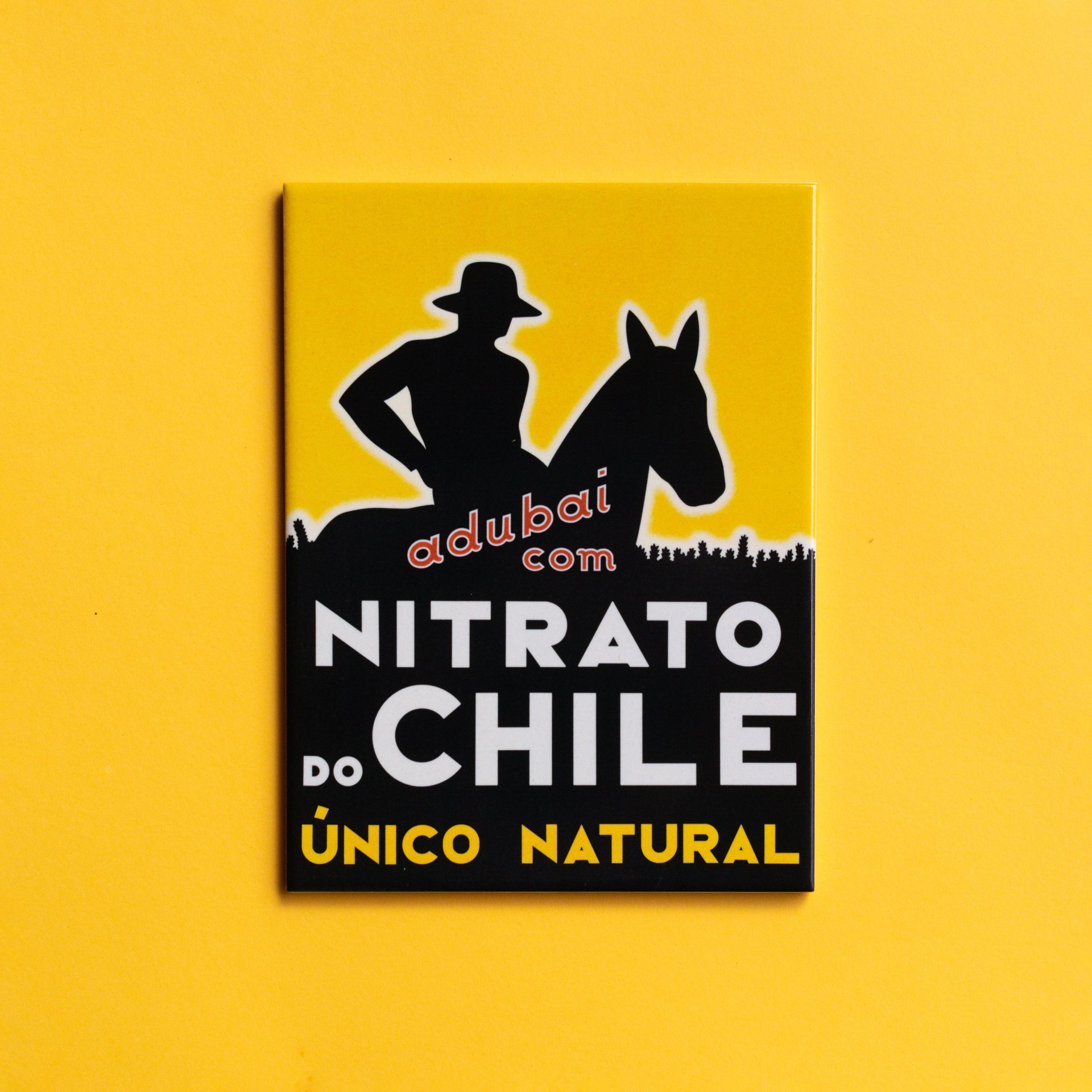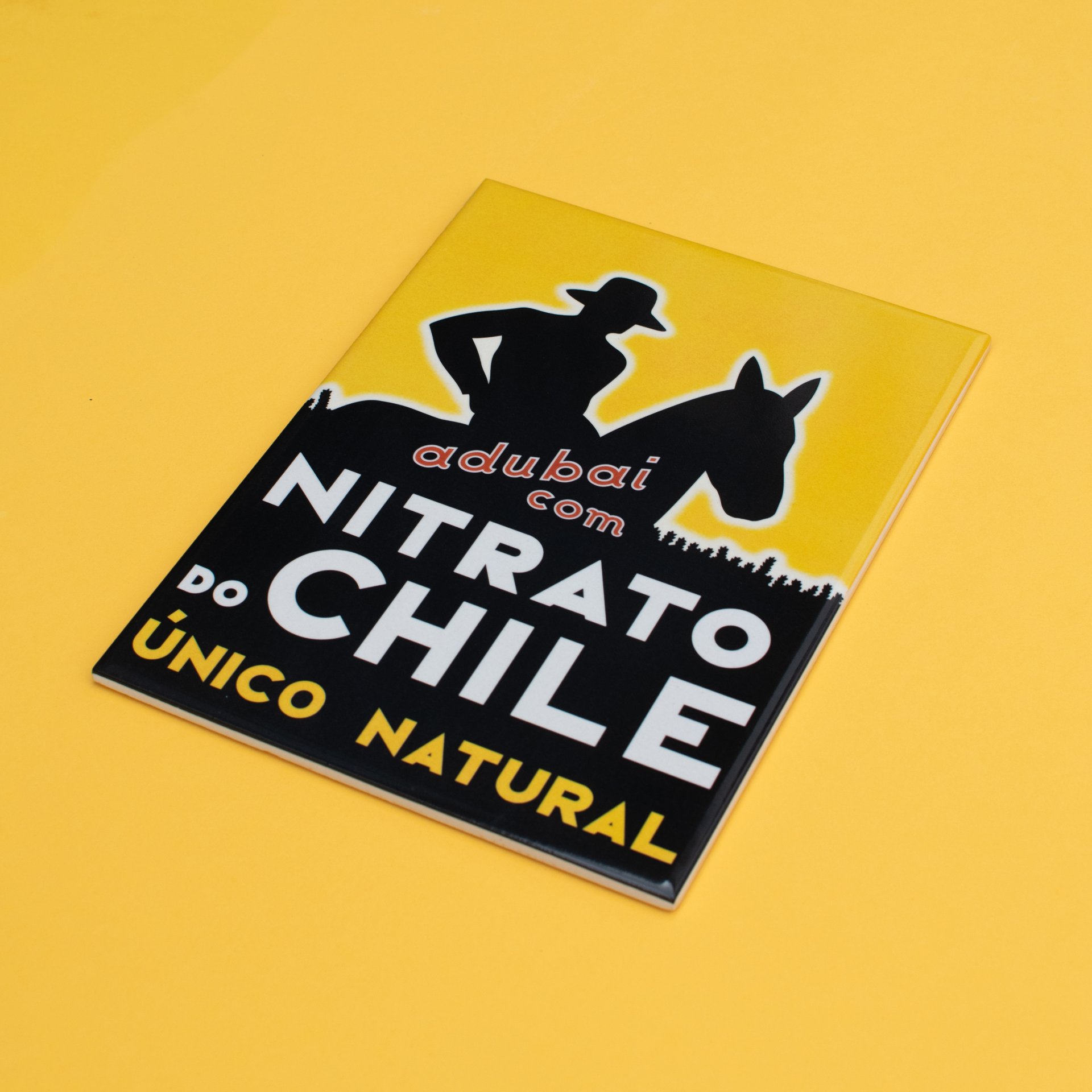 Azulejo vidrado de 20x15 cm inspirado no azulejo publicitário do Nitrato do Chile. Parte da coleção de mini-réplicas de azulejos publicitários antigos, todos com dimensões semelhantes.