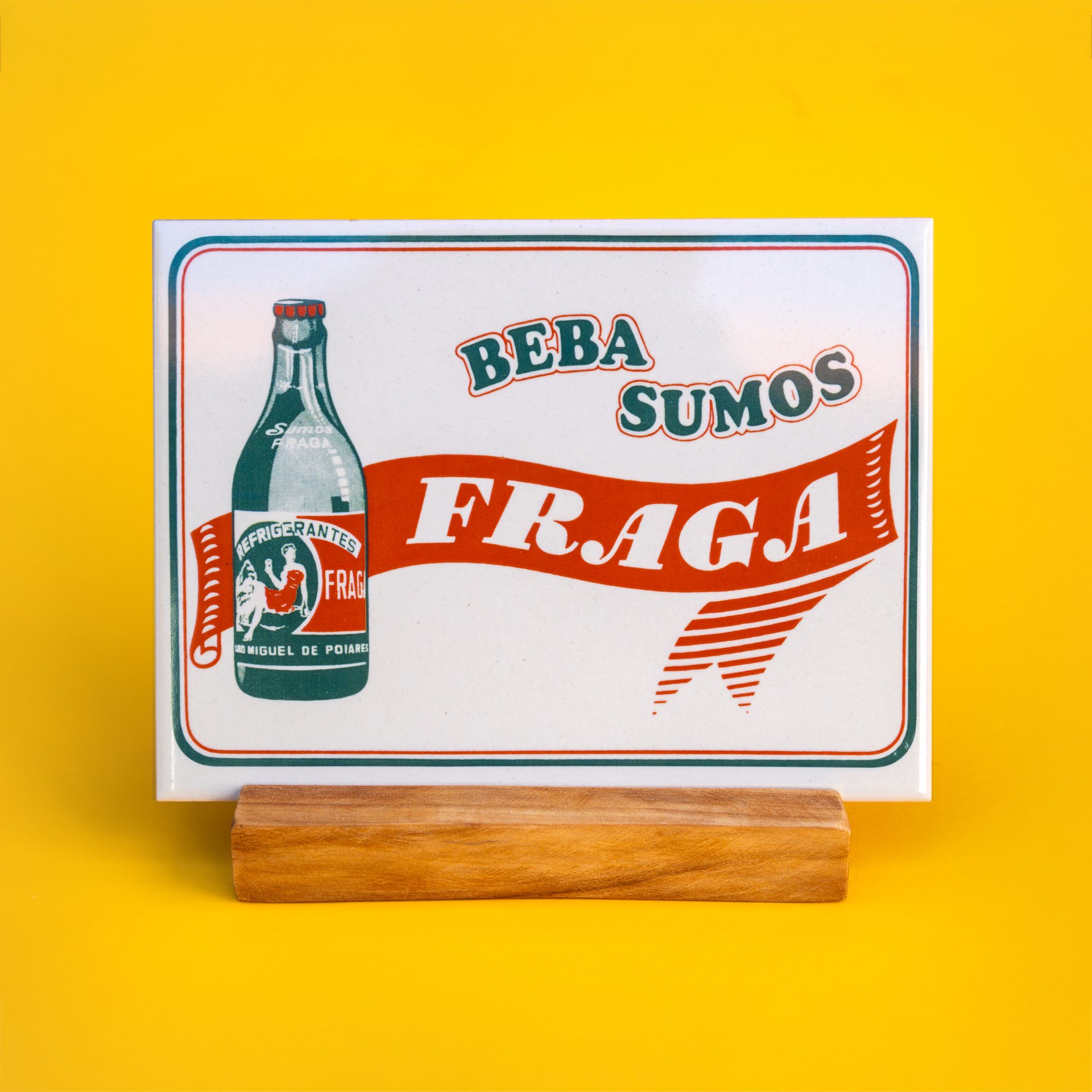 É nesse contexto e com esse objetivo que fizemos um azulejo publicitário sobre uma empresa que a nós nos diz muito, pelas nossas memórias de infância: Os sumos Fraga de São Miguel de Poiares. O azulejo consiste numa reprodução fiel de uma publicidade antiga a estes refrigerantes.