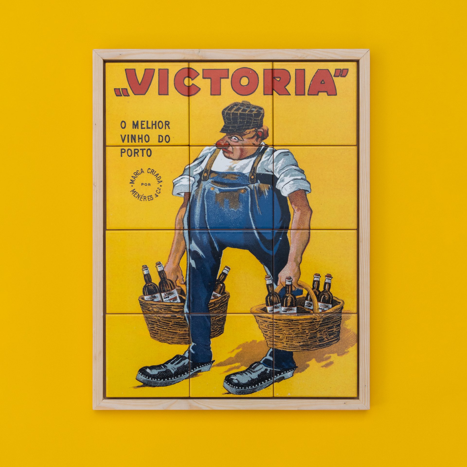 Réplica 4x3 em azulejos vidrados de 10 cm, com dimensão total 40x30 cm, inspirada no azulejo publicitário do vinho Victoria.